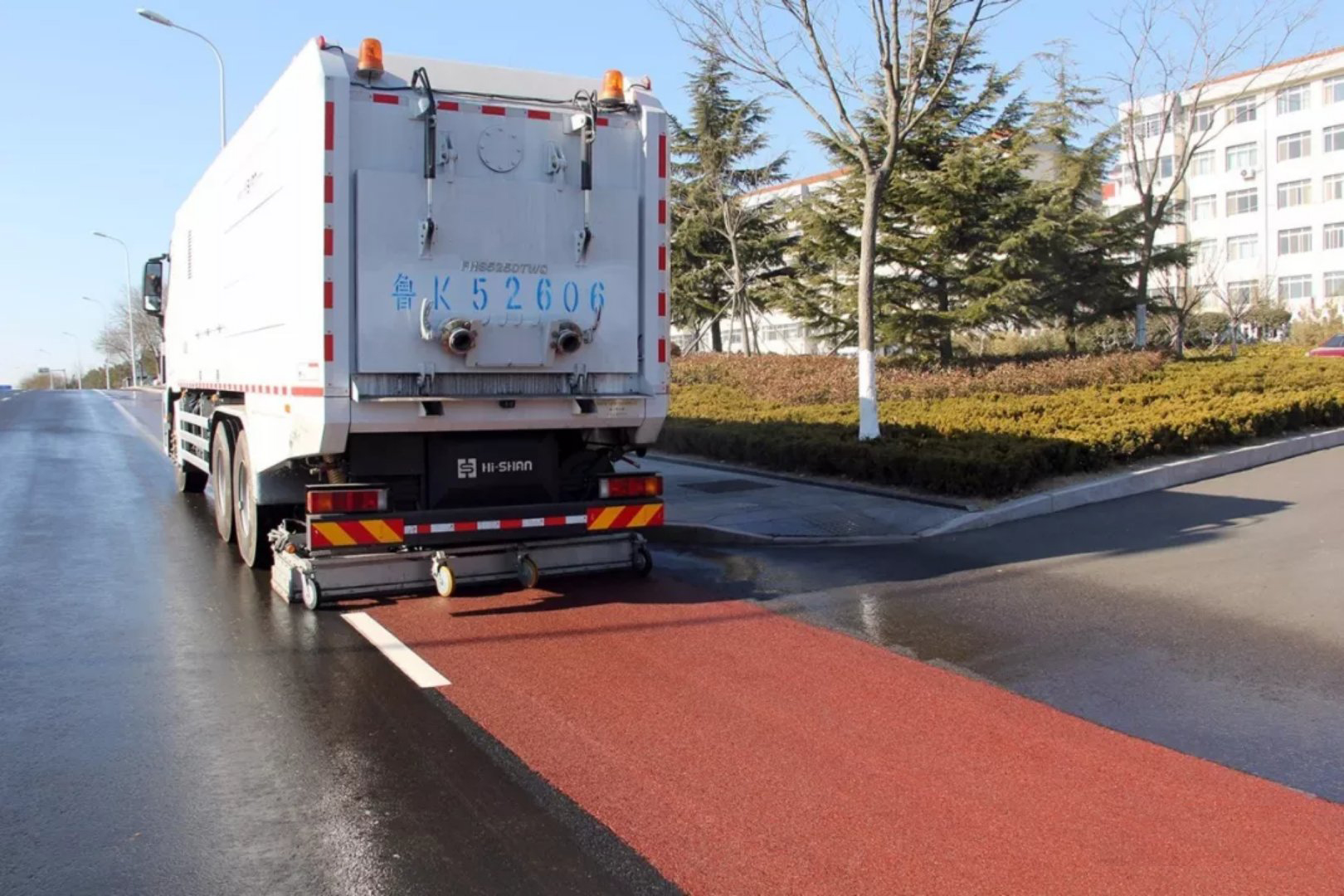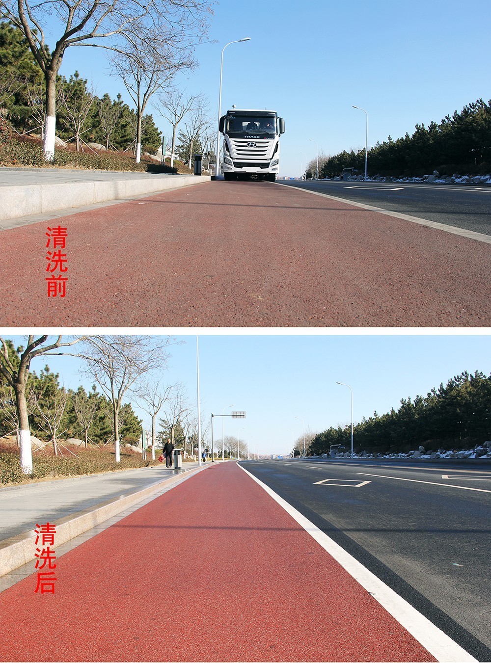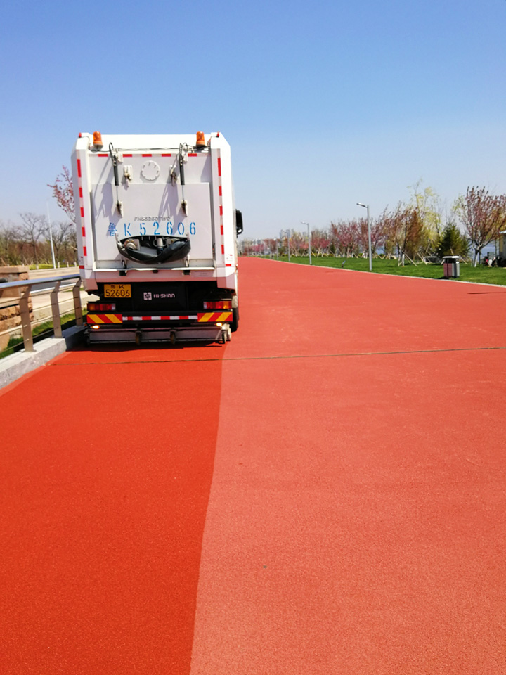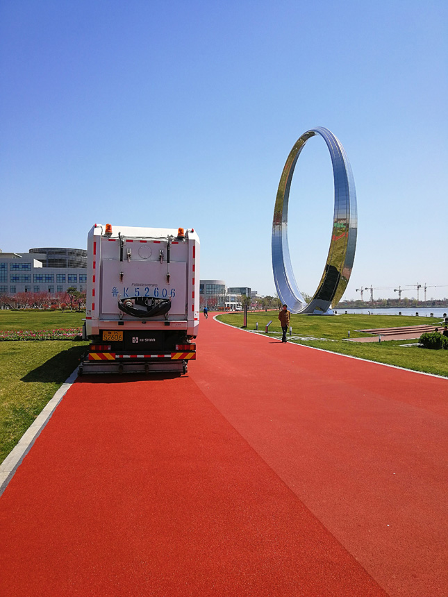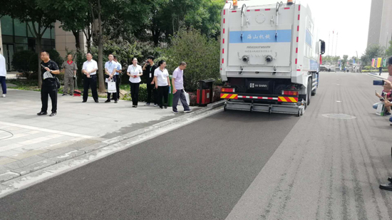 由它行駛之后的馬路,車后方的一條紅色瀝青路面凸顯,宛如剛剛鋪設完一樣嶄新道路,煥然一新,與兩側的車道形成鮮明對比,路面的透水縫隙、塑料顆粒清晰可見,路面白色標識線像剛噴涂過一樣的潔白,干凈整潔,效果突出,真正達到“席地而坐”的標準。市民們紛紛拿出手機拍照,并感嘆“路面從來沒見過掃的這么干凈,跟新鋪的一樣”。