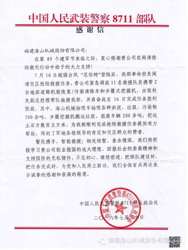 一方有難,八方支援,這是中華民族的傳統(tǒng)美德。警民攜手,共同幫助受洪災(zāi)區(qū)人民盡快恢復(fù)生活生產(chǎn),重建美好家園,也是我們應(yīng)盡的企業(yè)責(zé)任。為我們武警官兵的辛苦付出點(diǎn)贊,為我們的救援隊(duì)員點(diǎn)贊,你們都是最棒的。