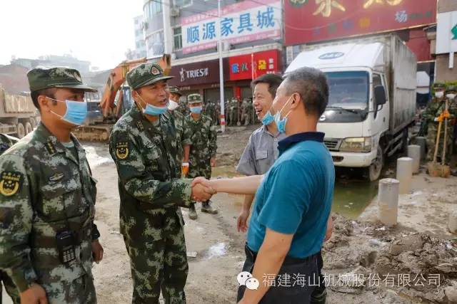 海山機(jī)械常務(wù)副總經(jīng)理張秋先與武警8710部隊(duì)梁團(tuán)長在坂東鎮(zhèn)指揮救災(zāi)