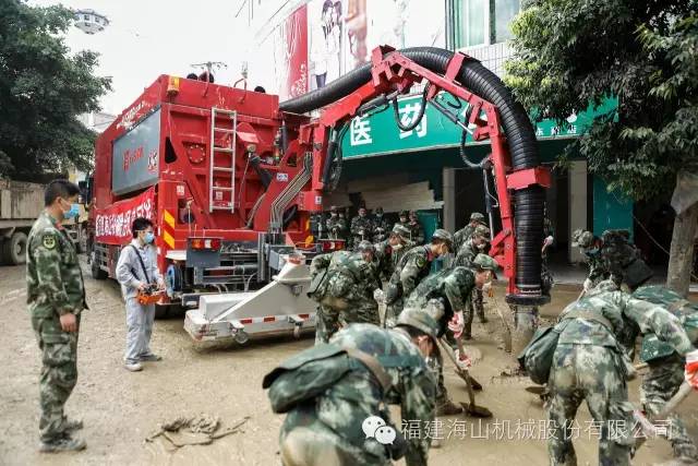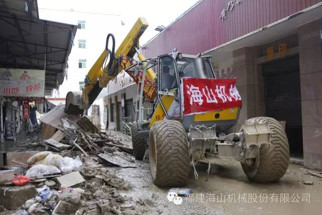 海山步履挖機(jī)與武警裝載機(jī)聯(lián)合清掃市場淤泥雜物
