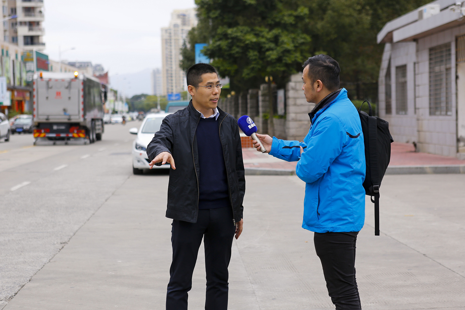 東南衛(wèi)視記者在莆田體育中心現(xiàn)場(chǎng)報(bào)道海山污染清除車