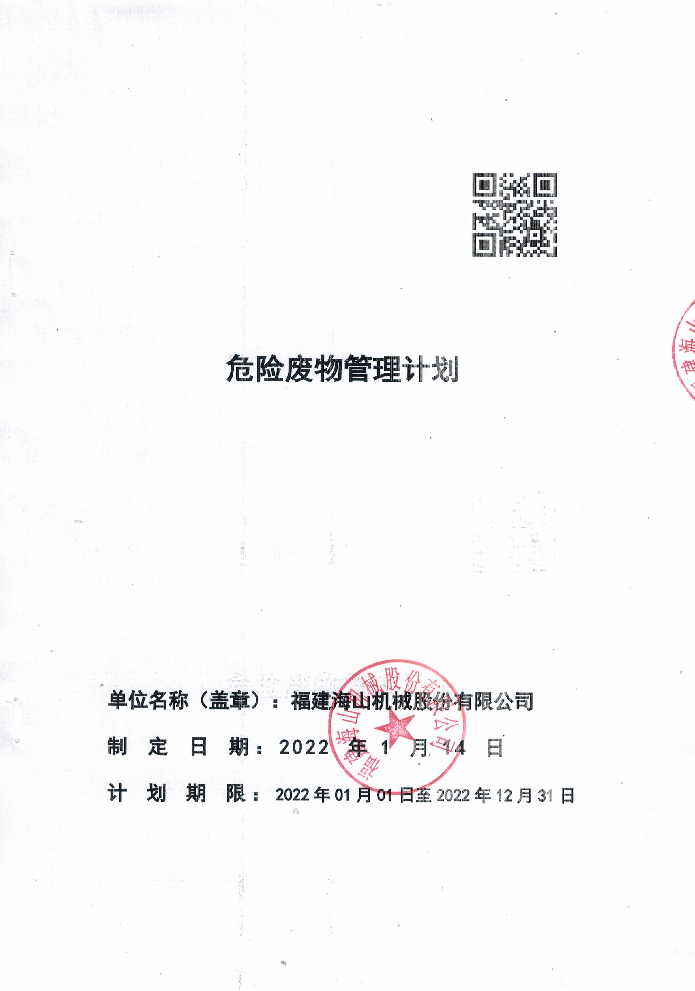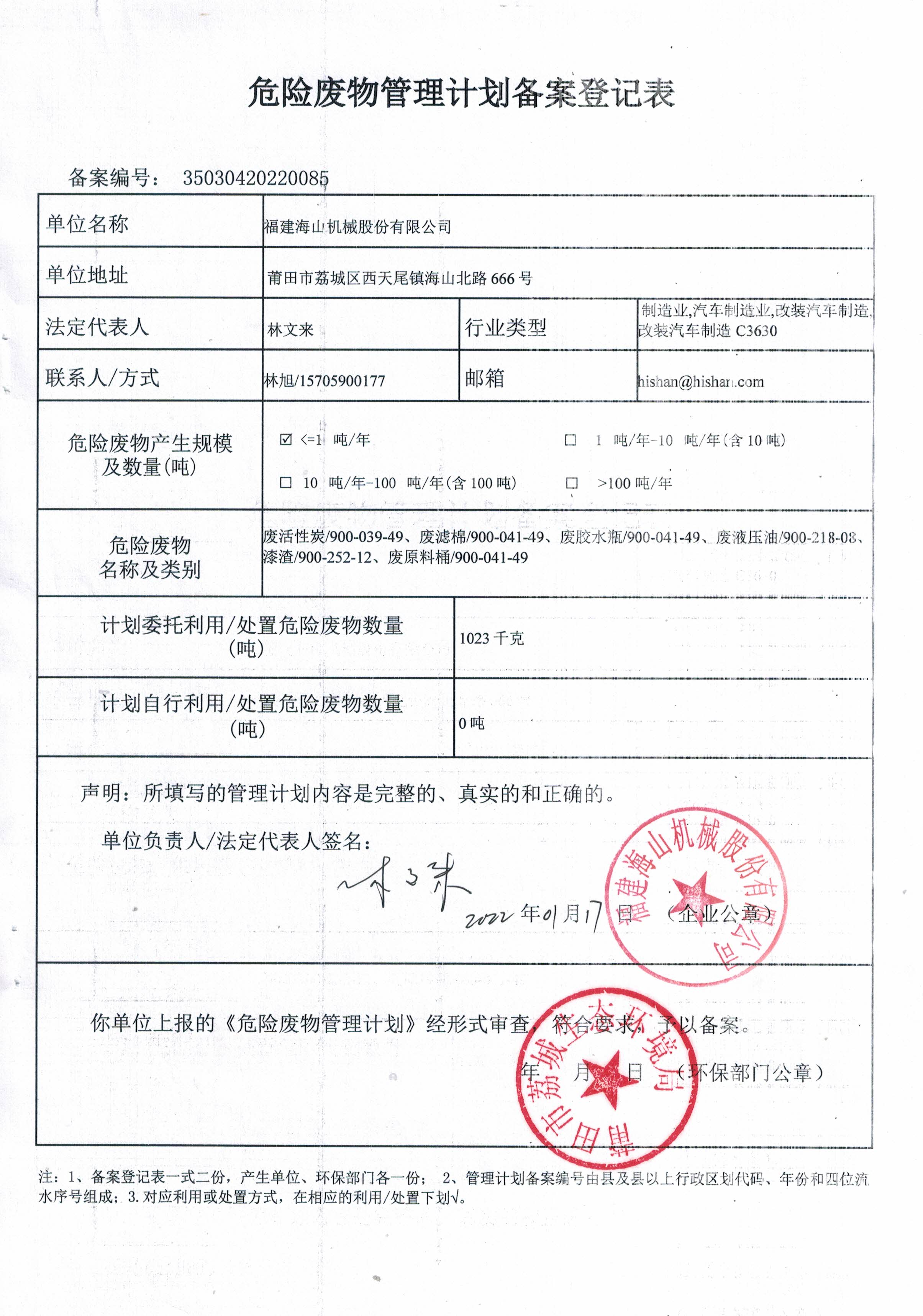 我司于2022年01月14日制定了《2022年度危險廢物管理計劃》,于2022年01月17日提交莆田市荔城生態環境局備案。 如下圖: