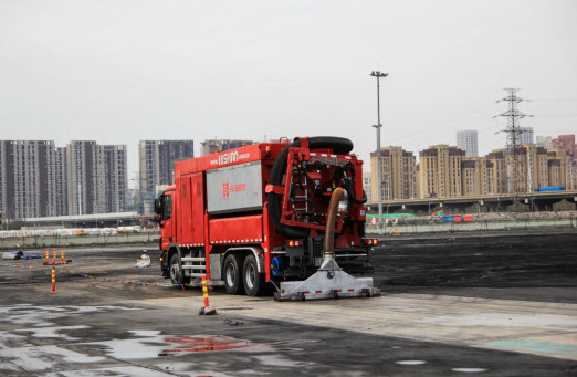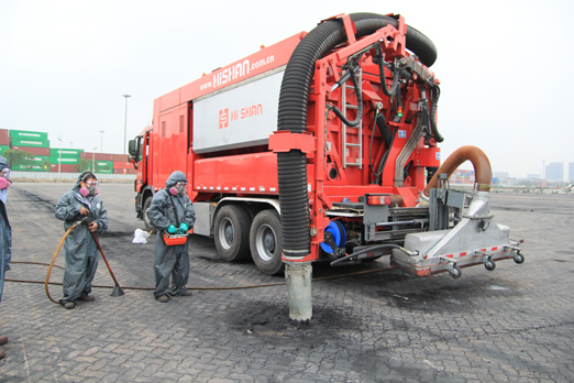 This operation is a reform to the traditional construction method of joint operations by road sweeper, sprinkler, and other cleaning equipments. One single suction excavator finished all tasks, with its performance confirming to the environment-protection requirements. Compared to traditional operation methods, the suction excavator enhances efficiency by five times, meanwhile leaving a clean road.